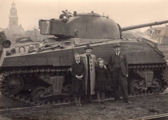 Joure. Een van de geparkeerde Sherman tanks van het Armoured Regiment van de Sherbrook Fusiliers op de Bûtsingel met de heer Y.A. Jelsma en Mevr. Antje Jelsma - Buursma en hun twee hongerwinter evacuees Jantina Theodora (geb. 30-11-1936) en Johan Marius Keizer (geb. 25-1-1935) uit de Kerklaan 84, De Bilt, die van 7 februari tot 25 juni 1945 bij hen waren ondergebracht. Zie ook foto f 5696 en f 5698.