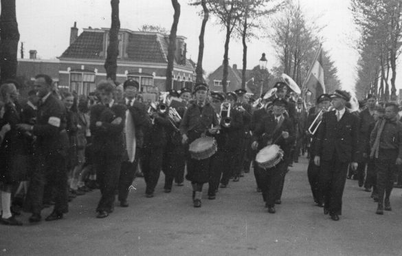 Joure, Muziekkorps “Concordia” in de volwassenenoptocht tegenover de toenmalige ULO school. Rechts vooraan dirigent R. Nijdam, links van hem trommelslager Marten de Wit (woonde aan de Hobbe van Baerdtstraat op de hoek met het voormalige Achterom). Links ….Blauw (?), de grote trom dragend en Hylke Mast, de grote trom slaand. Zie ook foto f 5736.