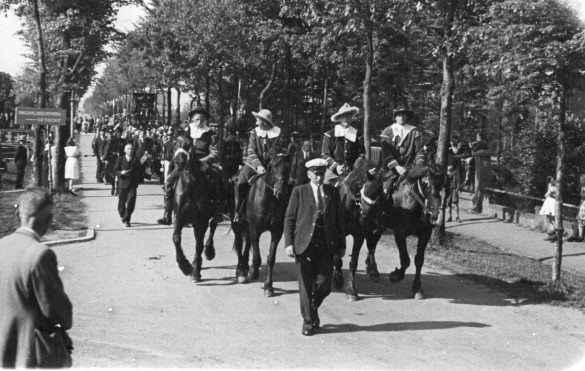 Joure, Waarschijnlijk de groep “Herauten te paard”, bestaand uit Gerrit Holtrop (boer in de Woudfennen) en Arjen, Hendrik en Wiebren de Jong tijdens volwassenenoptocht op de hoek met de Kerkstraat. Lopend links A. Halma, secretaris van de bevrijdingscommissie.