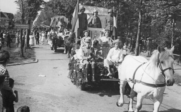 Joure, Versierde paard en wagen in de volwassenenoptocht op de hoek met de Kerkstraat.