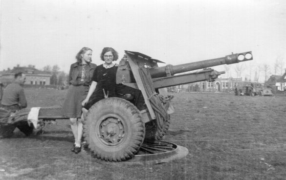 Joure, 25-ponder geschut van het 13de Field Regiment Royal Canadian Artillery op het terrein naast de voormalige ULO school waarmee Scharsterbrug, Sint Nicolaasga en Follega werden beschoten op 16 april 1945. Ze hadden onvoldoende vuurkracht om Lemmer te bereiken. Volgens eigen waarneming van Klaas Heida, woonachtig in Broek Zuid stonden tegenover de boerderijen aldaar van Sake de Wolf en Sake Terpstra ook kanonnen opgesteld die op dezelfde datum schoten hebben afgevuurd. Doel onbekend. Namen van de beide dames zijn onbekend. Zie ook foto f5744.