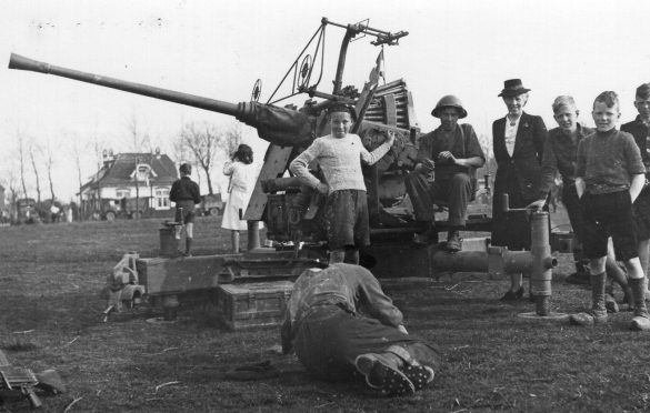 Joure, Luchtafweergeschut Bofors 40 mm. van het Anti Aircraft Regiment op het terrein naast de voormalige ULO school. Met hoed Mevr. Antje Jelsma – Buursma. Overige personen onbekend. Op de achtergrond de villa “Buitenzorg” van de fam. Spannninga.