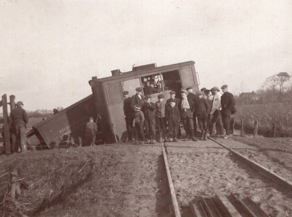 De goederentram van kwart over zevenen dinsdagavond 31 oktober 1916 uit Joure stiet even voorbij den overgang over den Hoogen Zomerdijk op een paard, eigen aan den heer C.de Jong (Wed. Douwe Egberts), dat letterlijk vermorzeld werd. Door den ontzettenden schok raakte de machine geheel dwars over den weg, doch kantelde gelukkig niet, zoodat de machinist Lenos, die nog uit alle macht geremd had, vrijwel met een geweldige schrik vrij kwam, De conducteurswagen, waarin de heeren Kolk en Sloothaak, schoot gelukkig tusschen machine en volgende zwaar beladen waterwagen uit en stak met het eene eind in de bermsloot. Juist daar echter moesten conducteurs het rijtuig verlaten. De deur werd ingetrapt en tot de schouders nat kwamen de mannen op het drooge. De waterwagen was tegen de machine opgestoven en nog een paar volgende wagens stonden buiten de rails, die op eenige plaatsen gesprongen en deels weggeslingerd, deels op- en omgebogen waren. De stremming van ’t verkeer werd door gepaste en vlugge maatregelen zoo goed mogelijk verholpen en ’s avonds tegen twaalven was er al een extra tram uit Drachten met personeel en werktuigen. Het ongelukkige paard, dat de oorzaak van deze ramp was, had op eigen houtje het terrein van de fabriek aan de Slachtedijk verlaten en was al dwalende daar op de tramrails terecht gekomen.