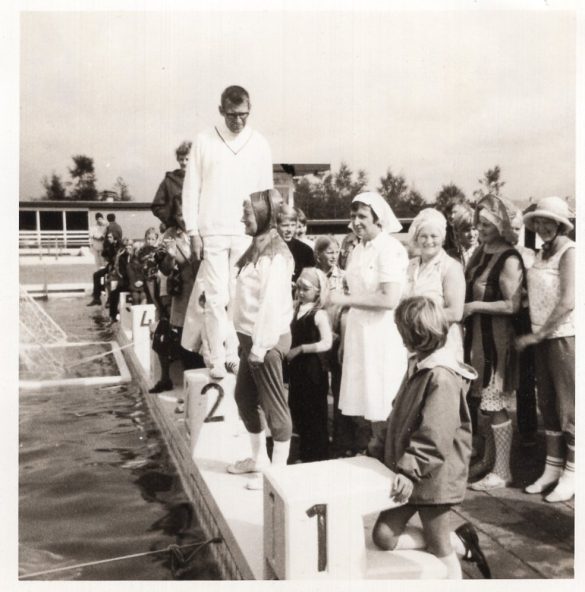 Joure, Diplomazwemmen voor zwemdiploma B met bij het startblok zweminstructeur Karel van der Plas. Suze Woudt staat te wachten in verpleegstersuniform om te water te gaan.